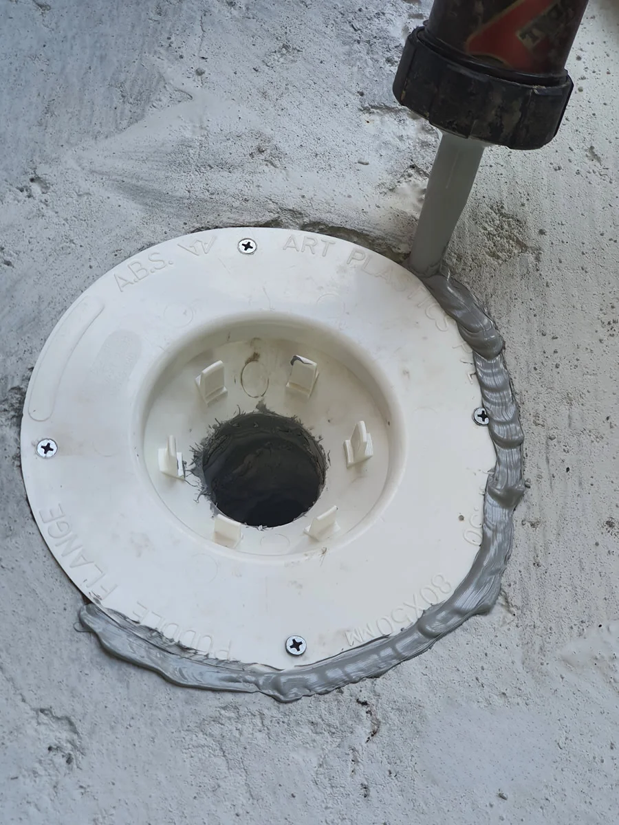 - Waterproofing below screed: Applied liquid membrane under the new screed with upturns. Installed puddle flanges.