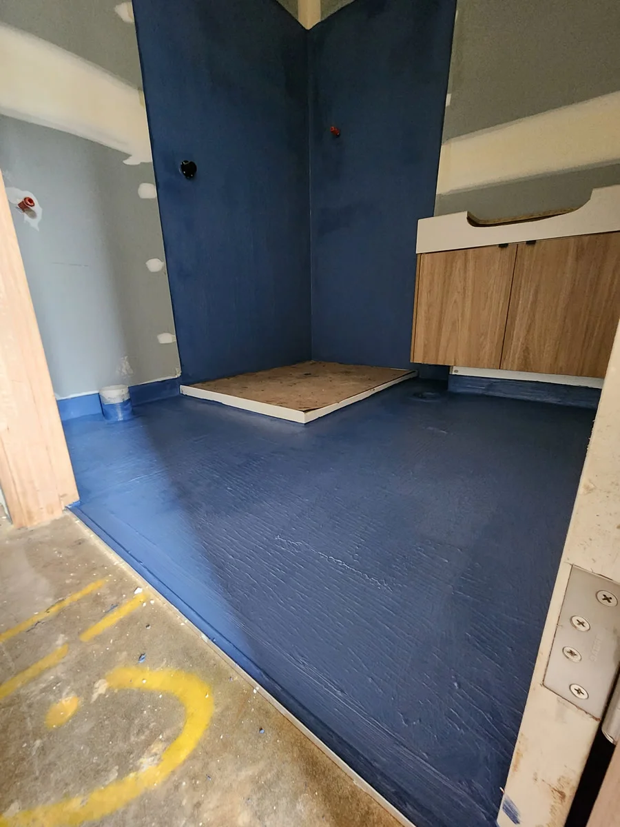 Install a compliant waterproofing system across all shower walls and bathroom floors using modern membrane technology.